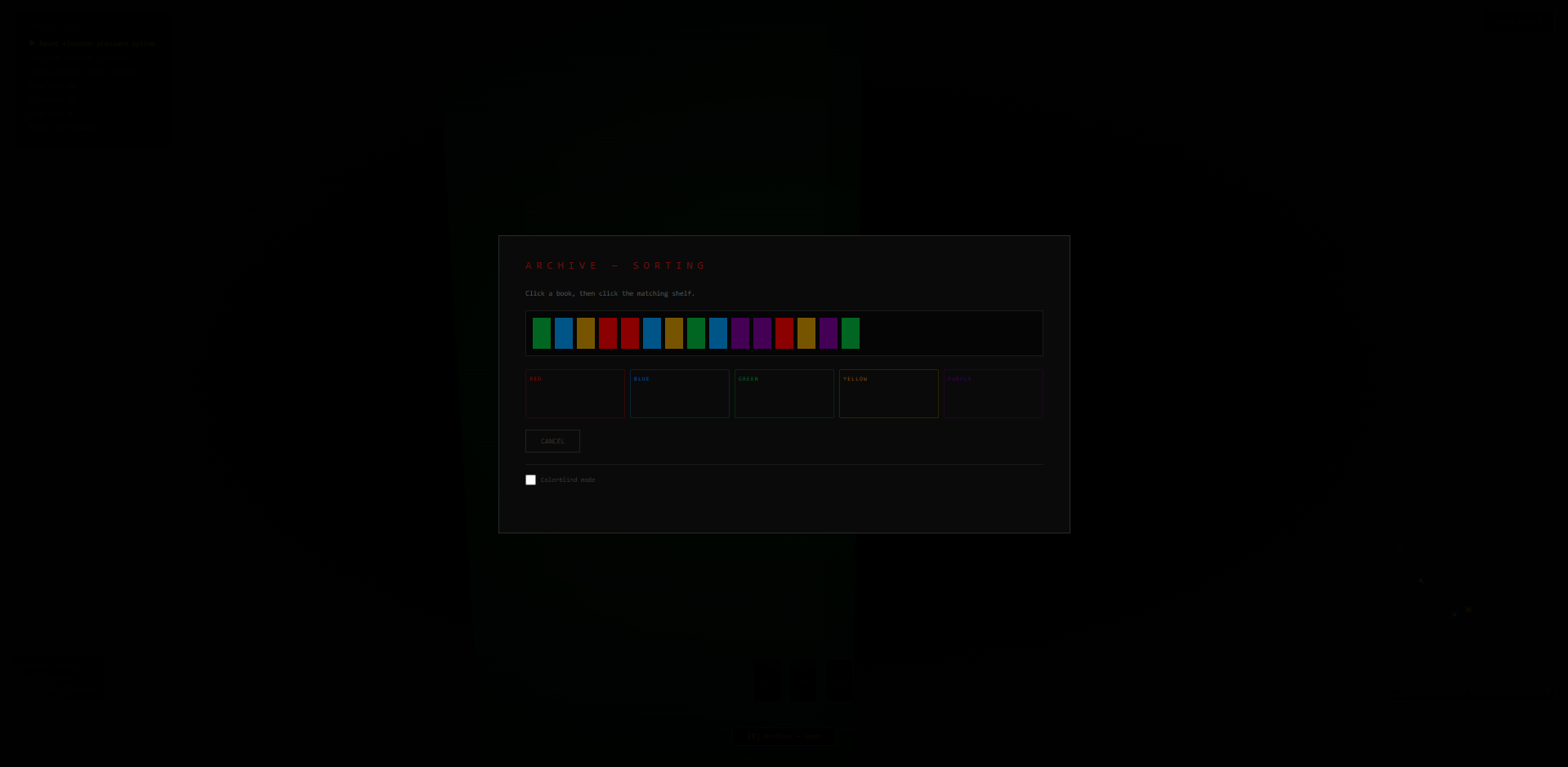 Three environmental puzzles stand between you and the fuses: reset the elevator pressure system by opening valves in the correct order, sort the archive by color under time pressure, and memorize and replicate a rotor activation sequence. Fail a puzzle step and the system fights back.